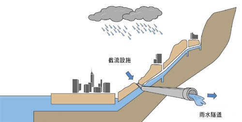 利用引水隧道將上游集水區的雨水改道由別處排出海,而不須流經下游市區。