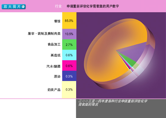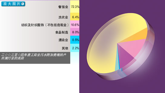 宗重新评估排污比率的申请。而在二○○三至○四年度获得批准的个案,则分别为571宗和41宗。下图是二○○三至○四年度各种行业申请重新评估工商业污水附加费收费率(重新评估化学需氧值)的情况。