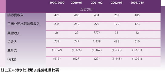 排污费及工商业污水附加费的总收入过去各年大致稳定,主要是因为自引入污水处理服务费后的收费水平一直维持不变。但在二○○一至○二年、二○○二至○三年和二○○三至○四年的总收入却较之前的两年低,原因是在二○○二年度财政预算案和及后在二○○三年因应严重急性呼吸系统综合症(SARS)而作出的排污费及工商业污水附加费宽减。另一方面,二○○三至○四年总开支则较去年减少二百万元。因此,污水处理服务于二○○三至○四年的亏损为十亿二千一百万元。
