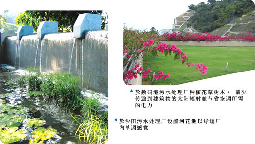 听取有关人士的意见 土地排水是郊区管理极为重要的一环。渠务署在编制这套有关兼顾环境因素的河道指引时,留意听取大自然爱好者和学者以及乡郊居民的想法。我们在二○○五年五月四日举办了「河道设计环境考虑因素工作坊」,向六个环保团体和三间大学的代表解释草拟中的指引,以及元朗排水绕道和新田西排水道的环保设计特色,然后带领他们参观元朗排水绕道的人造湿地。我们尽量把其后收到的一些具建设性的意见纳入指引中。由此证实保育人士、学者和工程师互相合作所产生的协同效益,非常可贵。 前瞻 我们努力的目标非常清晰,是要缔造一个能容纳天然水流动力,但同时可纾缓水浸对生命和财产所造成伤害的河流环境。这种河流环境需在保持其天然状况的同时,可供多元化的聚生活其中,并提供生态环境连系和野生生物走廊,供市民在其中学习、休憩和游览天然资产。 這套指引的編寫,以及社會整體重現保持水道天然/ 生態功能的意識,顯示我們正朝著在香港創造更優質生活的積極方向邁步。 绿化污水处理及泵房设施 渠务署明白绿化的景观可提升生活质素,因此一直着意进行绿化工作,使污水处理厂和污水及防洪抽水设施,在视觉上可能对邻近地方造成的影响得以缓和。绿化工作有助减轻视觉上单调的感觉、增加地方的生物多样性,亦可改善小气候,如提供荫蔽处、吸收热力及减少尘土飞扬。树木和花亦会随气候带出不同季节的感觉,增强美感。 设施外围的美化环境工作包括在外墙设置花圃、沿外围设置种植地带作为园景缓冲区,以及设置公众亦可享用的平台花园。 污水处理厂和污水泵房内的美化环境工作提高了该区的绿化比率,亦令公用设施建筑物在外形、构造特质和颜色上更为和谐。绿化地带缓和混凝土建筑物、沉淀池、泵房、排气管、围墙和空地给人的感觉。显著的例子包括昂船洲污水处理厂、沙田污水处理厂和数码港污水处理厂。