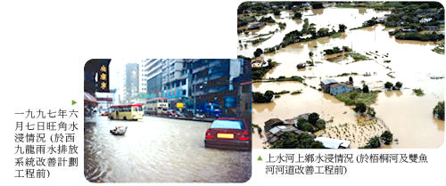 | 概要 香港大部分地區已有適當的防洪保護,只是新界北部的天然洪氾平原和低窪地方仍會發生水浸。而且,一些如西九龍的舊區,由於多年前建造的系統排水能力不足,亦經常發生水浸。 ![]() 為了解決水浸問題,渠務署在新界進行一系列總值達一百億元的河道治理和鄉村防洪抽水站工程,並在西九龍實施造價三十七億元的市區雨水排放系統改善工程,以大幅度提高這些地區的排洪能力。自一九九七年,我們在新界北部地區完成約55公里的河道工程,並有24個鄉村防洪抽水計劃在運作當中,大大紓緩了新界北及新界西北的水浸情況。自一九九五年,我們在市區及郊區地方共消除了82個水浸黑點。 ![]() 二○○四至○五年內發生的水浸事件 二○○四年全年共錄得約1 739毫米的雨量紀錄,比平均2 214毫米的降雨量低約21%。年內,黃色暴雨警告信號共懸掛過16次。而紅色及黑色暴雨警告信號,只在二○○四年五月八日大雨當日早上各懸掛過一次,並影響九龍半島西面地區。我們接獲旺角及深水埗低窪地方的水浸報告,其時,西九龍雨水排放系統改善計劃尚未完成。除此以外,沒有在其他地方發生嚴重水浸事件。 ![]() 隨著改善工程第一及二期相繼於二○○三年及 二○○四年大致完成,西九龍水浸問題已陸續得到改善。尤其是於二○○四年年底,「大坑東地下蓄洪池」及「啟德雨水轉運計劃」工程的完成,更是渠務署在解決西九龍地區水浸的重要成就。 二○○四至○五年度的進展 總值約二十億元的防洪工程終於大致上完成。這些工程包括元朗橫洲村的一個鄉村防洪抽水計劃、牛潭尾一段2.3公里長的排水道、西九龍共23公里長的雨水渠、大坑東一個容量達十萬立方米的蓄洪池,以及由窩打老道至啟德明渠的一條1.42公里長的雨水隧道。 ![]() 為進一步解決水浸問題,政府現正積極進行一系列的大型雨水排放改善工程,以提高全港的防洪水平。建造中的工程包括在新界造價二十二億元,以及在西九龍造價約七億元的工程。此外,在新界、西九龍和其他易受水浸地區(例如東九龍、荃灣、港島北部),另有造價六十三億元的雨水排放系統改善工程,正於策劃或設計階段。這些主要雨水排放系統改善工程計劃詳載於附錄A,而工程計劃的施工地點則載於附錄B。 減少水浸黑點 本署自一九九四年已找到超過一百個水浸黑點。這些黑點全部在我們嚴密的監察之下,而我們亦已採取改善措施以消除或減低水浸的風險。去年,我們已成功消除了10個水浸黑點。 ![]() 市區的防洪工作 市區的防洪工程主要包括改善雨水排放網絡,以便有效率地收集和輸送雨水。在特別情況下,我們會利用創新的方法例如蓄洪池、抽水站或把洪水分流的方式,以縮減那些可能對交通造成滋擾或與地下公用設施相阻的工程範圍。 在九龍市區,「西九龍雨水排放改善工程計劃」第1及第2階段的工程已分別於二○○三年六月及 二○○四年十二月竣工。當中包括為油麻地、旺角、九龍塘、深水埗和荔枝角建造約33公里的雨水渠,和建造大坑東地下蓄洪池及由九龍塘至啟德明渠的雨水轉運隧道。而於第3階段,建造約12公里雨水渠的工程現正進行中,並預計於二○○七年完成。我們現時亦正著手策劃在荔枝角建造雨水轉運計劃,原因是該區一帶受到上游的地面徑流,以及九龍區水塘潛在溢流所造成的水浸風險影響。 ![]() 我們亦就港島北部和東九龍易受水浸地區策劃造價26億元的雨水排放改善工程。為減少挖掘渠坑對這些地方的居民及道路交通的滋擾,我們計劃建造雨水排放隧道,把雨水從半山引到別的地方,以紓緩現時排水量不足的市區排水系統的壓力。 新界的防洪工作 新界的防洪工程大致可分為兩大類:計有興建排水道收集和輸送洪水入大海,以及建造鄉村防洪抽水計劃,以保護低窪地區的村落。 隨著近年若干排水道完成,新界的水浸情況,特別是新界北部的羅湖、河上鄉、燕崗和天平山,以及新界西北的天水圍、元朗和錦田的水浸情況已有顯著改善。以往狹窄多彎的天然河道一旦出現泛濫,新界的洪氾平原便不時會出現水深1至1.5米的水浸。現時在這些易受水浸地區成千上萬的居民已得以免受水浸的威脅。 ![]() 至於在洪氾平原內的低窪村落,我們已完成了24個鄉村防洪抽水計劃,使31條村落免受水浸威脅。現時居於超過240公頃低窪地區村落的3萬居民已受到保護。 在新界北部,治理深圳河計劃第3階段工程及平原河修復計劃進展順利。當這兩項雨水排放改善工程在二○○六年完成後,新界北部最後的一個嚴重性水浸黑點老鼠嶺的水浸情況將可大為改善。 ![]() 在新界西北,元朗排水繞道和新田東主排水道,以及大橋、水邊村及米埔老圍/米埔新村的三個鄉村防洪抽水計劃的建造工程均進展順利。 我們現正著手策劃在屯門、沙田、大埔、荃灣及大嶼山等地區的排水系統的改善工程。 新系統為雨季作更好的準備 為了監測水浸情況及為排水系統水力模型提供數據資料,渠務署建立了一套洪氾監測系統。在這系統下,全港各區的河流及渠道設置了超過60個全自動水位測量站,全天候地不斷監察即時的水位情況和收集雨量及潮汐等水文資料。現時大部分的水位測量站已利用超聲波測量儀精確地量度河道水位,並即時把資料傳送至渠務署的控制中心。利用這些即時的水位數據、視像動畫及測量站操作狀況資料,在控制中心當值的