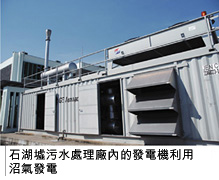 為更有效使用剩餘的沼氣,渠務署現正進行多方研究,其中包括在石湖墟污水處理廠安裝了一台330千瓦的電熱聯供沼氣發電機,其產生的電力可供應污水廠內設施使用,而發電機所產生的熱能,則供應污泥消化缸以維持污泥消化所需的溫度。該發電機已於二OO六年二月啟用。 |