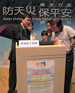 晴天行動:防天災 保平安 為期一年的公眾教育活動 ─ 「晴天行動:防天災 保平安」,已於二○○六年五月完滿結束。是次活動的目的是要加強公眾對自然災害的認識,從而懂得居安思危,預防及減少自然災害,確保平安。有關活動是由保安局、土木工程拓展署、香港天文台、渠務署、新聞處及香港紅十字會合辦。 |