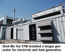 In order to make the best use of surplus biogas, the Department is investigating into various options. For example, a 330 kW biogas Combined Heat and Power generator was installed at Shek Wu Hui STW. The generator supplies electricity for the facilities within the sewage treatment works and provides the necessary heat for the sludge digestion tanks. The generator has been in operation since February 2006. |