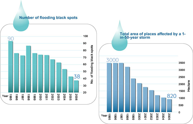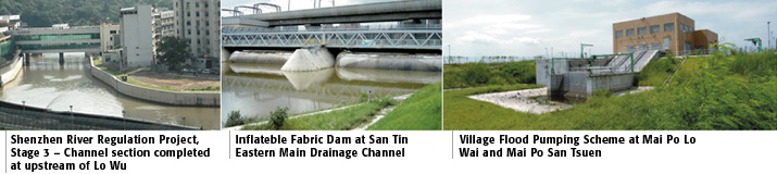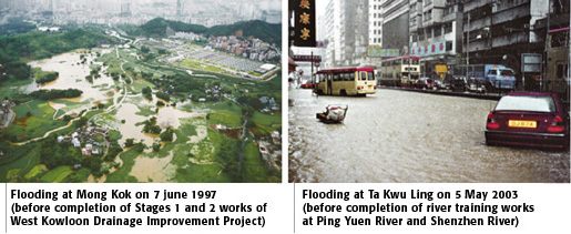 Flood Prevention in NT To solve the flooding problem in the Northern and North-western NT, the Government has commenced a series of major flood control projects at a total estimated cost of about $8.8 billion. In the Northern NT, $2.4 billion of works have been completed, and about $0.8 billion of construction projects are in progress. In addition, new drainage improvement projects under various planning and detailed design stages are estimated to cost a total of $0.9 billion. In the North-western NT, the costs of the completed works, on-going construction projects, and flood control projects under planning and design stages are estimated at $3.8 billion, $0.6 billion and $0.3 billion respectively. Flood prevention projects in the NT can broadly be classified into two main types, namely drainage channels to collect and convey floodwater to the sea and village flood pumping schemes to protect villages in low-lying areas. With the completion of drainage channels in recent years, the flooding situation in the NT has been significantly improved, particularly in Lo Wu, Ho Sheung Heung, Yin Kong and Tin Ping Shan in the Northern NT and Tin Shui Wai, Yuen Long and Kam Tin in the Northwestern NT. In the past, floodplains in the NT were often susceptible to flooding to 1 to 1.5 m depth as overflow took place along the old river sections which were narrow and sinuous. Nowadays, tens of thousands of people in these flood prone areas have been relieved of flood risks. As regards low-lying villages in the flood plain areas, we have already completed 25 village flood pumping schemes to remove the flood risks at 33 low-lying villages. Over 240 hectares of low-lying villages areas accommodating a population of 30,000 people are now being protected. In the Northern NT, the rehabilitation of Ping Yuen River has been completed and the Stage 3 works of the Shenzhen River Regulation Project was in good progress. Upon completion of Shenzhen River Regulation Project, the flooding situation at Lo Shue Ling, the last regional flooding black spot in the Northern NT, will be significantly improved. In the Northwestern NT, construction works of Yuen Long Bypass Floodway and San Tin Eastern Main Drainage Channel, as well as the village flood pumping scheme at Mai Po Lo Wai/Mai Po San Tsuen were completed. Construction work of village flood pumping schemes at Tai Kiu and Shui Pin Tsuen were progressing well. Plans are also in hand to improve the stormwater drainage systems in Tuen Mun, Sha Tin, Tai Po, Tsuen Wan, Sai Kung and the Lantau Island. |