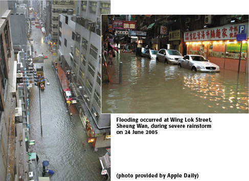 Flooding Incidents in 2005-06 In 2005, the annual rainfall depth was around 3,215 mm, significantly higher than the average of 2,214 mm by about 45%. Amber Rainstorm Warning Signal was hoisted 16 times. Red Rainstorm Warning Signal was only hoisted in the morning on 24 June 2005, which mainly affected the Northern NT, East Kowloon and Western Hong Kong Island, in particular Wing Lok Street in Sheung Wan and Smithfield Road in Kennedy Town. There were minor flooding events in Sheung Shui, Tai Po and Ta Kwu Ling areas. In particular, the flooding in Sheung Wan and Smithfield Road has aroused much concern of the public. To alleviate flooding in Sheung Wan, an intercepting drain commenced construction in March 2006 and a floodwater pumping station commenced construction in July 2006 for completion in 2009. Before completion of the work, a system of sending flood warning in SMS or voice message, namely Sheung Wan Flood Watch, was launched in April 2006 to alert residents and shopkeepers in Sheung Wan of possible flooding in order to minimize losses. Due to the overshooting of