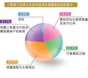 在二零零八至零九年度,我們接到並圓滿解答約6,800宗電話查詢、1,500宗書面查詢及73宗市民親臨服務中心提出的查詢。二零零八至零九年度的查詢宗數較上一年度為高,增加的宗數主要是有關申請行業重新分類及污水渠接駁情況的查詢。自一九九五年四月以來接到的查詢數字載於網上版附錄G。