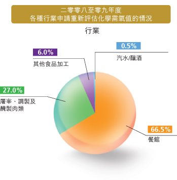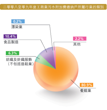 在二零零八至零九年度,我們共收到200宗重新評估工商業污水附加費收費率的申請和27宗重新評估排污比率的申請。在此年度獲得批准的個案,則分別為187宗和8宗。附圖是二零零八至零九年度各種行業申請重新評估工商業污水附加費收費率(重新評估化學需氧值)的情況。 |