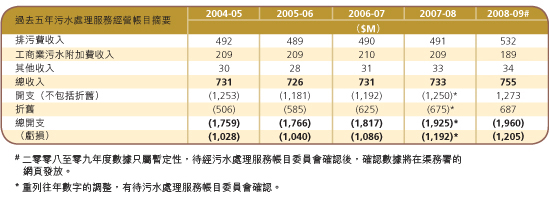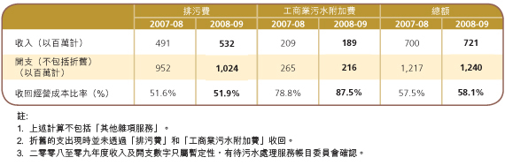 排污費和工商業污水附加費收費率分別於二零零八年四月一日及八月一日起調整,排污費收費率由原先每立方米用水1.20元調整至1.31元。經計算後,二零零八至零九年度的污水處理服務淨收入比去年度上升了2,100萬元,總開支(不包括折舊) 則上升了2,300萬元,而由於營運開支增加及新設施投入服務,折舊因此增加1,200萬元。整體而言,污水處理服務於二零零八至零九年度的虧損為12.05億元,較去年度增加1,300萬元。