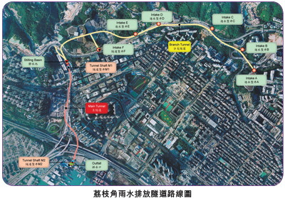 為解決荔枝角區的水浸問題,我們正興建造價約17億元的荔枝角雨水排放隧道,此工程按計劃於二零零八年底展開,預計在二零一二年完成。荔枝角雨水排放隧道包括一條長約3.7公里、直徑約4.9米的雨水排放隧道,由澤安邨伸展,途經衛民村舊址,至維多利亞港;其間,在上游會興建6個進水口在山腰截取沿山坡流下來的徑流。