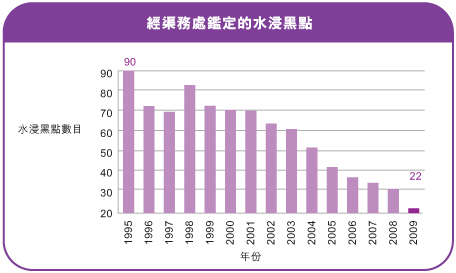 自一九九五年以來,渠務署已鑑定超過一百三十多個水浸黑點。隨著多項大型防洪工程相繼完工,我們在市區及郊區地方共消除了109個水浸黑點。去年,我們成功消除了11個水浸黑點。餘下22個水浸黑點,大多已有渠務改善工程在進行中,以紓緩水浸威脅。我們正持續監察著這些水浸黑點,特別在暴雨下的排洪情況,待改善工程完成後,可望更多的水浸黑點得到消除。 |