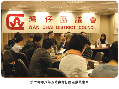 為落實政府建議加強與區議員之溝通,渠務署出席不同地區的區議會會議,向當區的議員介紹本署的職能和在該區的主要工程項目。除了各級同事出席不同地區的區議會會議,在二零零八至零九年度,署長先後到訪了中西區、大埔、沙田、南區、黃大仙區區議會,這不但加強了政府與地區間之連繫,而且更可聽取議員對我們工作的寶貴意見。 |
