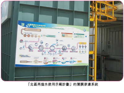 | 除了擴建工程外,渠務署還協助環保署於二零零八年年底完成了一個兩年期的「北區再造水使用示範計劃」。此試驗計劃採用了先進的薄膜滲濾技術,將經二級處理的排放水水質進一步提升後運送到自願參與示範計劃的學校、安老院和村屋作沖廁、淋花、和其他非飲用用途。 |