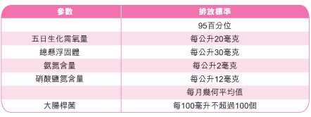 要衡量一所污水處理廠在環境方面的效益,最好是量度它的污染物清除量和經處理的排放水的水質。為確保污水處理廠運作正常,經處理的排放水的水質受到排放牌照制度的監管。在排放牌照內,經處理的排放水的排放條款由環保署設定,當中包括總懸浮固體、五日生化需氧量、氨氮、總氮和大腸桿菌的數量。 |
