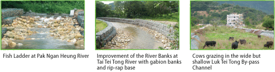 At Luk Tei Tong, a shallow but wide by-pass channel was constructed to mimic the original native marshland features. In order to restore the ecology of the area, the original top soil together with the seeds and roots of the native plant species were removed before commencement of construction and stored for reuse subsequently as top soil along the channel bed. As a result, the original marshland plant species have re-established successfully in the area.