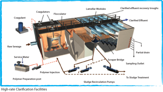 A type of proprietary high-rate clarification facilities instead of conventional CEPT design will be built for removal of Suspended Solids and Biological Oxygen Demand from the raw sewage. The high-rate clarification facilities that combine optimised flocculation, internal and external sludge recirculation, thickening in two conjoined vessels would maximise hydraulic loading and treatment efficiencies. This advanced sewage treatment technology has gained popularity in Europe, North America and the Mainland China in recent years. |