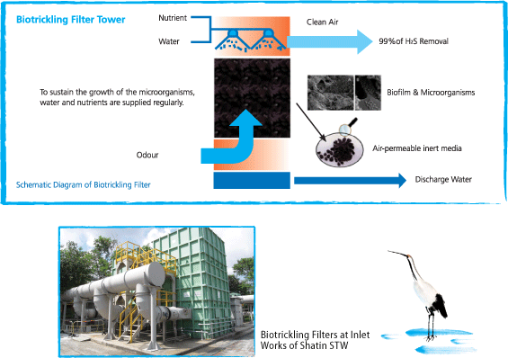 The first biotrickling filter deodorising system was installed at the Inlet Works of Shatin STW in July 2008. It is able to handle foul airflow up to 25,000 m3/hr with H2S level at 20 ppm.