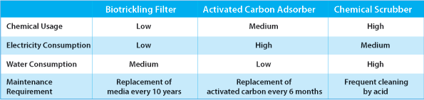 | The advantages of the biotrickling filter over activated carbon adsorber and chemical scrubber are its significant saving in terms of chemical usage, energy and water consumptions as well as minimum operation and maintenance requirements. |