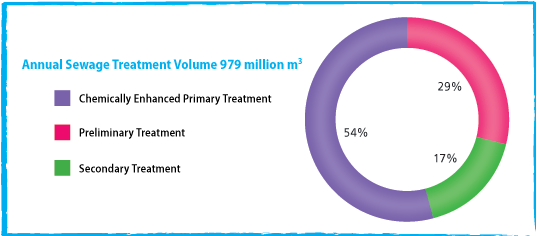| In 2009-10, we treated 979 million m3 of sewage in total. 29 per cent of the sewage received Preliminary Treatment, 54 per cent received Chemically Enhanced Primary Treatment (CEPT) and 17 per cent received Secondary Treatment. |