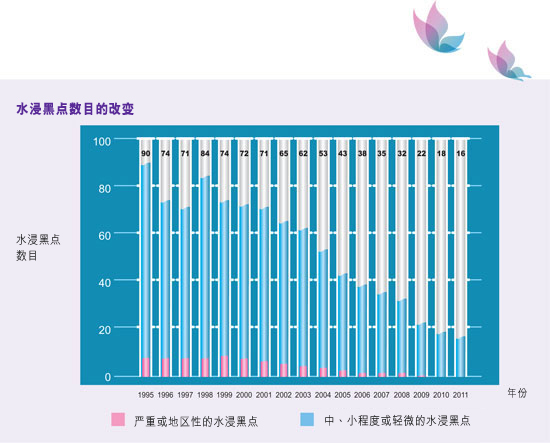 经过我们的不断努力,同时随着多项防洪工程相继完竣,余下的主要水浸黑点已被消除,现只余下16个较轻微的。我们会继续密切监察这些水浸黑点在暴雨下的情况,并期望在其他改善工程完成后逐一消除。