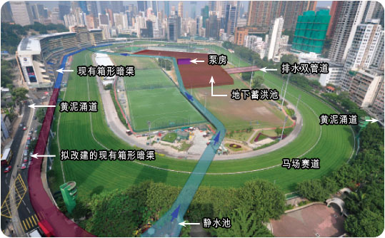 我们以既创新又务实的防洪方案,计划在跑马地马场的游乐场之下,兴建一个地底蓄洪池。跑马地地下蓄洪计划是继二零零四年为解决旺角区水浸问题的大坑东蓄洪池计划后的第二个地下蓄洪池。跑马地蓄洪池贮水量达六万立方米,并配置箱形暗渠和泵水设施。该计划现已进入设计阶段,工程预计于二零一二年年中展开,并于二零一八年年初完成。工程将分两期施工,第一期将兴建半个地下蓄洪池、泵房和箱形暗渠。第一期计划可望于二零一五年年初启用。