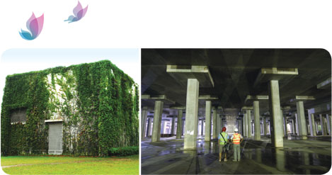 已竣工的大坑东蓄洪池计划的地面泵房(左)和地下蓄洪池(右)