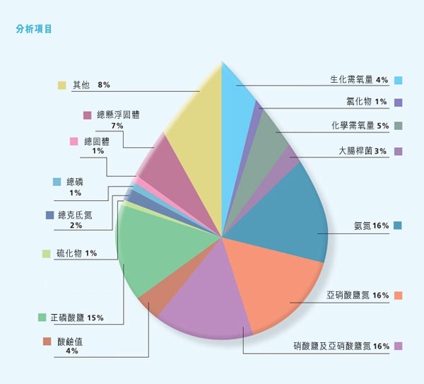 沙田中央化驗室 – 分析服務 我們在沙田中央化驗室進行廣泛的樣本測試,項目超過14種。在全面的採樣計劃下,此化驗室為不同的污水處理設施進行污染物負荷的測量和處理效率的監察,以確保經處理後的排放水符合排放牌照的要求,同時為品質監控提供準確的數據。 在二零一零至二零一一年年度內,我們的化驗室先後進行了151210項分析,其分佈如下: