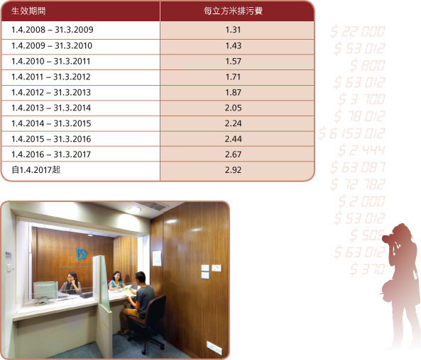 為了堅守污染者自付的原則,並鼓勵市民節約寶貴食水,立法會已通過十年遞增排污費,並由二零零八年四月一日起生效。自當天起修訂的排污費率從原來的每立方米供水量1.2元增至1.31元。然後每年以比率9.3%遞增,直至二零一七年四月一日的每立方米 供水量 2.92元。