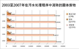 从污水中所清除的污染物,每天产生814公吨污泥,或相等于全年约30万公吨污泥。污泥在运往堆填区弃置前会先进行脱水,以缩减其体积,藉此减省所需的堆填区空间,从而有助延长堆填区的使用期。除了污泥外,污水处理程序进行时也会清除筛除物和砂砾。在2007年,我们共弃置约297