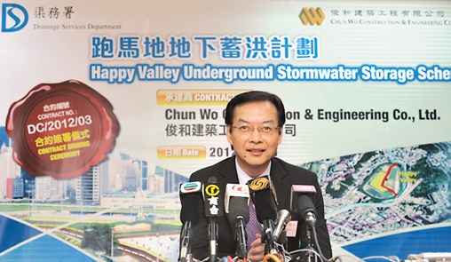 - On 5 September 2012, media covered the contract signing ceremony for our major works of the "Happy Valley Underground Stormwater Storage Scheme", the biggest New Engineering Contract (NEC) project ever awarded by the Government, marking a new milestone in the development of the flood prevention project for the Wan Chai and Happy Valley districts. Reporters were briefed on the planning, design and construction of the scheme after the ceremony.