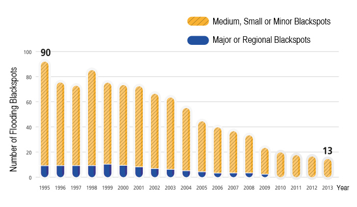 In 2012-13, we have further eliminated two flooding blackspots at Ha Wo Che Village in Sha Tin and Ling Tsui Tau Tsuen in Mui Wo, reducing the number of blackspots from 15 to 13 in 2013.