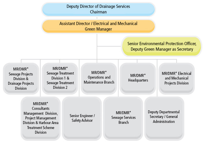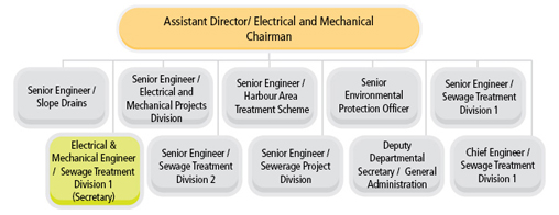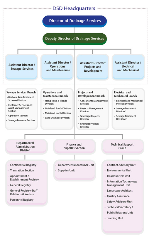Supporting our two core services namely sewage treatment and flood prevention, our Department is headed by a Director with the assistance of a Deputy Director and four Assistant Directors. There are four branches within the department, namely the Sewage Services Branch, the Operations and Maintenance Branch, the Projects and Development Branch and the Electrical and Mechanical Branch, comprising fifteen functional Divisions/Sections. There are also individual sections at the headquarters rendering technical, accounting and administrative support.
