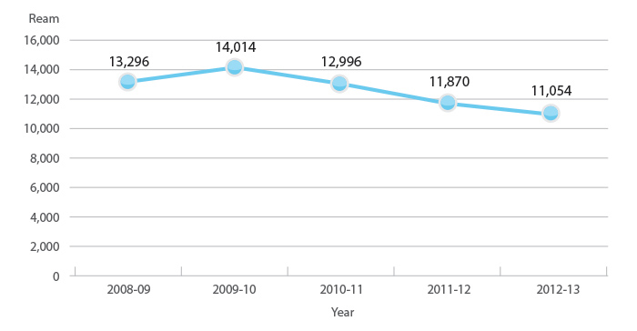 With the fast development of wireless communication technology, we have introduced a "paperless meeting" system, using electronic gadgets such as tablet computers and notebooks for presentations and discussions. About 252 paperless meetings were conducted in 2012-13 with 1,900- plus e-documents circulated and viewed through this system. Together with other green measures such as electronic circulation and doublesided printing, paper consumption has continued to drop since 2009-10. Paper usage in 2012-13 was about 11,000 reams, a 21 per cent reduction compared to 2009-10.
