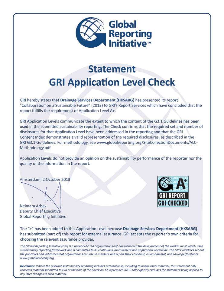 DSD provided us with their self declaration of compliance within GRI G3.1 Guidelines and the classification to align with application level A+. Based on our review, we confirm that social responsibility and sustainable development indicators with reference to the GRI Index are reported, partially reported or omitted. In our professional opinion the self declaration covers the DSD's social responsibility and sustainability issues, however, the future report will be improved by the following areas: