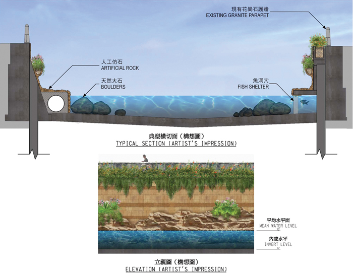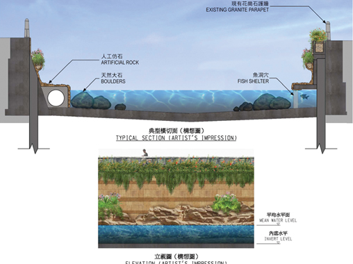 To engage the public on the planning of Kai Tak River, we conducted a two-stage public engagement exercise on "Building our Kai Tak River" in 2010 and 2011. According to the engagement results, there are strong public aspirations for revitalising Kai Tak River into an attractive green river and townscape feature to enhance its visual quality and image, in addition to its prime objective for flood protection. To meet such aspirations, we have incorporated various landscape, greening and ecological elements in the Kai Tak River Improvement Works with a view to rehabilitating the Kai Tak River into a green river corridor in urban areas. Greening works include installation of planters and artificial rock along the river walls. Selected species of submerged plants will also be cultivated at river bed to foster a natural environment. The existing granite parapets along the river walls will be retained in general for heritage conservation purpose. Though the ecological value of the existing riparian habitat is relatively low, we will introduce fish shelters and boulders on river bed to enhance the microhabitat and species diversity. These have been proven successful in the river improvement works at Ho Chung River in Sai Kung.
