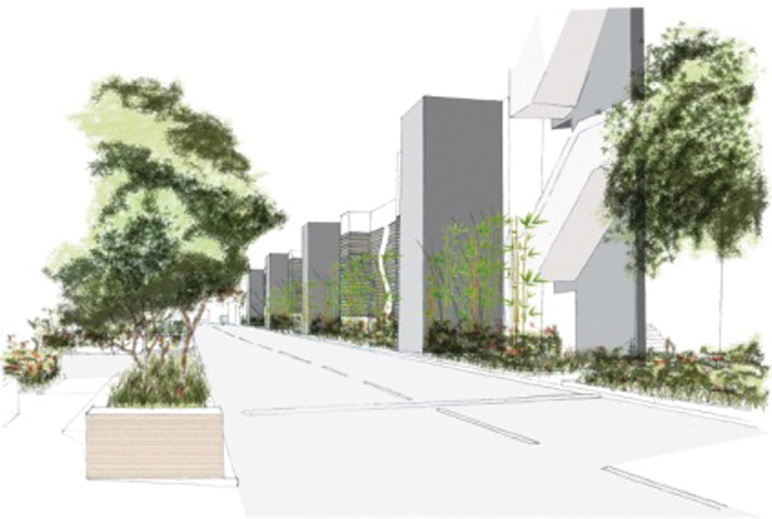 The elevation treatment consists of three main features, namely synthetic timber cladding, green vegetation at ground and roof levels, and a signature series of tricolor Shanghai render modular panels reflecting the ancient Chinese pictogram for water, which improve the appearance of the buildings.