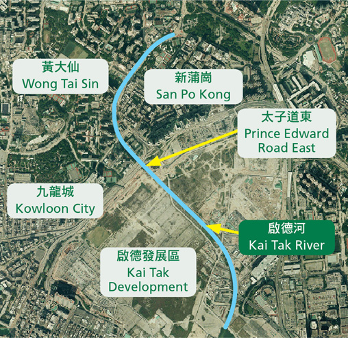 Kai Tak River is one of the major drainage channels in East Kowloon. It originates from Po Kong Village Road at Wong Tai Sin, flows parallel to Choi Hung Road and Tung Kwong Road adjacent to Tung Tau Estate and Tung Wui Estate, runs underneath Prince Edward Road East before traversing the Kai Tak Development (KTD) area and finally discharges into Victoria Harbour. The total length of Kai Tak River is about 2.4 kilometres. It was built in tandem with the former Kai Tak Airport some decades ago and found inadequate to meet the current flood protection standard. Flooding incidents have occurred along Choi Hung Road during heavy rainstorms and severely affected the traffic of Wong Tai Sin and its adjacent districts.The Kai Tak River Improvement Works are being implemented , which aim to improve its drainage capacity and mitigate flooding risk to the surrounding areas.