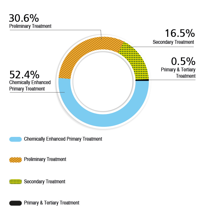 In 2012-13, we treated 1,001 million cubic metres of sewage in total. 30.6 per cent of the sewage received Preliminary Treatment, 52.4 per cent received Chemically Enhanced Primary Treatment (CEPT), 16.5 per cent received Secondary Treatment and 0.5 per cent received Primary & Tertiary Treatment.