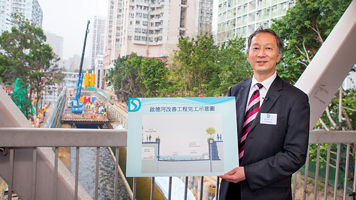 Director of Drainage Services, Mr. Chan Chi-chiu, guided the media visiting Kai Tak River Improvement Works (Upstream Portion)