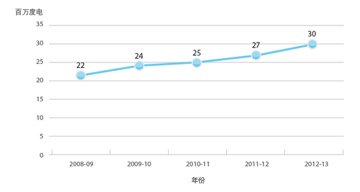 我们留意到污水处理过程中所产生的污泥,在厌氧消化过程中形成的生物气是一种可再生能源,因此,过去10年,我们均在探讨如何更有效利用所产生的生物气体,包括在我们的污水厂内安装热电联供发电机和微型涡轮。热电联供发电机和微型燃机系统是从单一的燃料(如生物气)以获取能量。通过燃烧,同时产生热能和电能,从而提高整体能源使用效率。燃烧生物气的热电联供发电机和微型涡轮是碳排放量较低的清洁科技。我们正于沙田及大埔污水处理厂内安装新的热电联供发电机(总容量为2.03兆瓦),而在元朗污水处理厂则安装微型涡轮(容量为30千瓦)。加上最近在大埔污水处理厂和石湖墟污水处理厂安装的热电联供发电机(大埔的发电机于2010年进行测试,容量为625千瓦;石湖墟的发电机于2011年进行测试,容量为635千瓦),我们预期于2013年可以充分利用从污水处理所产生的生物气体。由生物气体所产生的电力连续5年上升,而2012-13年所产生的电力上升至约3,000万度电。