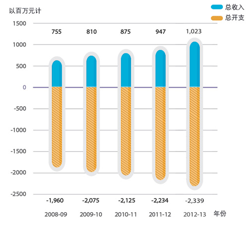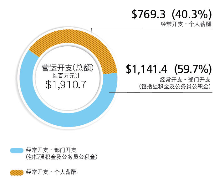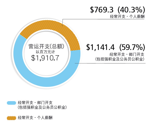 2012-13年度,本署总营运开支约为19亿元,其中个人薪酬的开支约为7.7亿元,余款则用于部门开支及非经常开支。