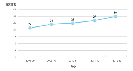 過去5年,我們成功節省了超過1,100萬度電。我們採取了各項措施大幅減少能源使用,當中包括優化污水處理流程;在各污水處理廠採用熱電聯供設施;將各廠內的T8光管與戶外照明燈分別更換為T5光管和發光二極管燈;以及在我們的處理設施內使用高效率的水泵電動機。在2012-13年度,最大型的節能項目是沙田污水處理廠的污泥混合沉澱與污泥處理優化程序,以及在石湖墟污水處理廠採用生物氣供給熱電聯供設施進行操作。