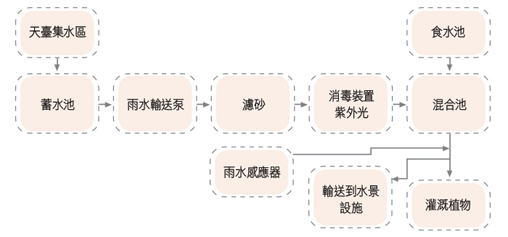 我們裝設了蓄水池收集天臺的雨水,利用雨水輸送泵將雨水輸送至濾砂池,在池內隔去固體粒子,然後進入殺菌裝置以紫外光消毒,再於混合池與食水混和。混合池可確保持續有雨水或食水供應作灌溉用途,當中食水主要在雨量較少的旱季使用。混合池的水除用於灌溉,還可供應1號污水泵房的水景設施。