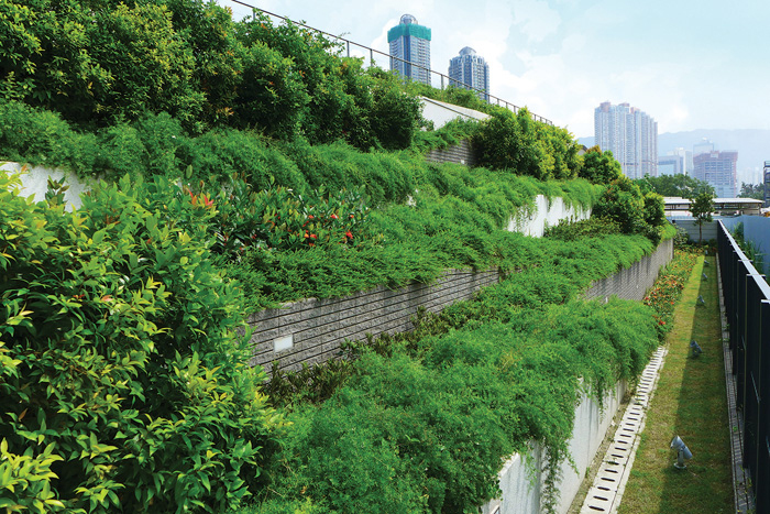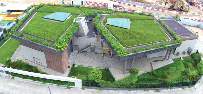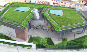 Kowloon City Sewage Pumping Station (SPS) No. 1 & 2 are located at the rim of Kai Tak Development Area. Aiming to achieve a sustainable design, the facilities have implanted the design concept of creating an urban oasis. The building surfaces are well integrated with green infrastructure elements such as pervious grass pavement, vertical greening, roof garden and rain garden to maximise the green coverage. The SPSs occupied an area of about 5,600 square metre, of which about 4,300 square metres are landscaping area. The concept of rainwater harvesting has also been introduced and the collected rainwater would be used for irrigation purpose within the facilties. The green roofs have adopted two different colours and textures to create a vivid geometry and to enhance the visual interest. With all these green elements, the SPSs provide a visual relief to the surrounding residents and enrich the urban biodiversity.