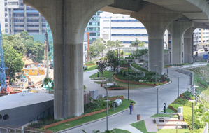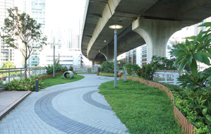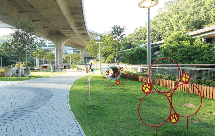 The 7,000 square metres pet garden was built on top of the stilling basin of Lai Chi Kok Drainage Tunnel and beneath the viaduct of Tsing Sha Highway. This single piece of land serves the multi-purpose of flood prevention, transportation and recreation at the same time. To preserve water resources, the rainwater collected in Lai Chi Kok Drainage Tunnel will be used, upon suitable treatment, for non-potable uses such as for toilet flushing, irrigation and general cleansing within the pet garden, as well as for street cleansing by the Food and Environmental Hygiene Department in Sham Shui Po district.