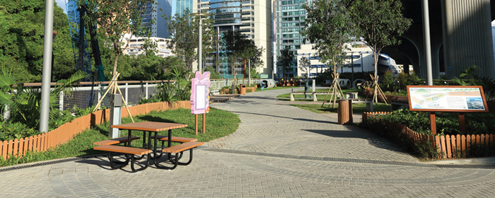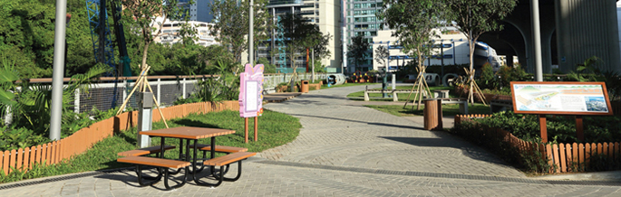 Throughout the lifecycle of our facilities for flood alleviation and sewage treatment, we strive to promote environmental conservation and sustainability by embracing the concept of “Blue-Green Infrastructure”, by which “Blue” refers to water bodies while “Green” represents landscaping and greening. The 0.8 hectare engineered wetland for supporting the flourishing ecosystem under drainage improvement works in Shuen Wan, as well as the pet garden built atop the stilling basin of LCKDT, are the cases in point. Furthermore, we have initiated a joint research with the academia to study overseas experience in revitalising urban streams and formulate guidelines for future project’s reference.