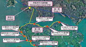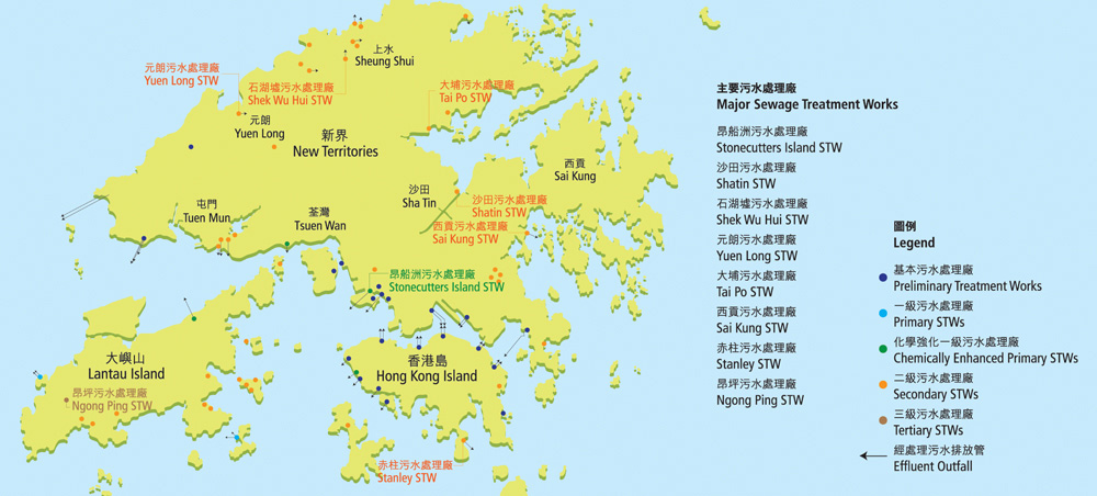 DSD has developed a sewerage network of nearly 1,700 kilometres long to collect sewage in the territory. The system is now serving 93 per cent of the total population. Through different types of treatment processes and adoption of advanced technologies, most of the pollutants, toxic materials and bacteria in the sewage will be removed to a level meeting the statutory environmental and discharge standards.