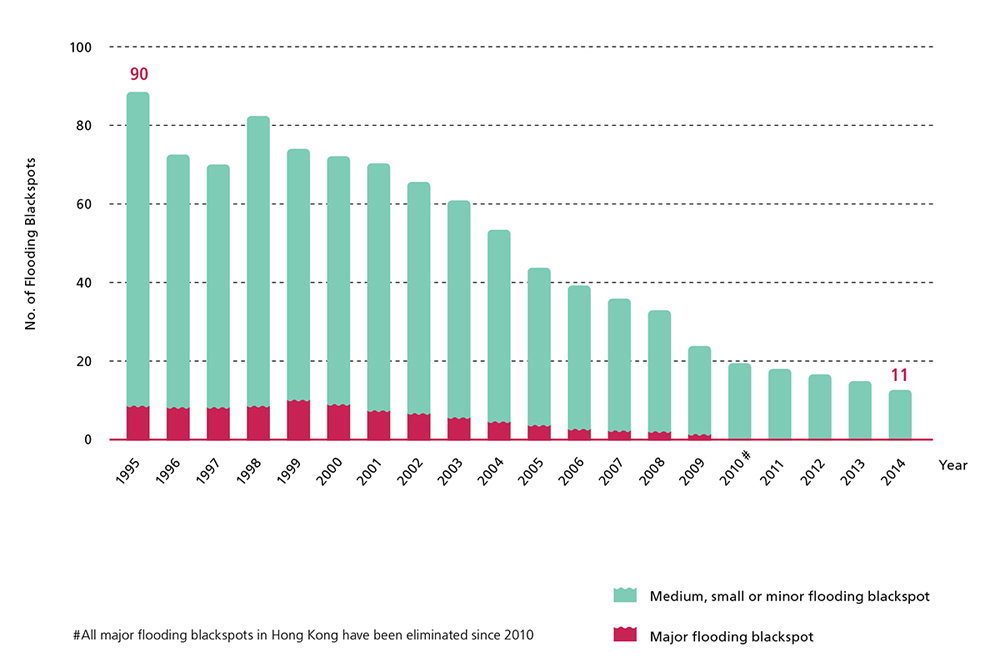 In the annual review of early 2014, we evaluated the effectiveness of the completed drainage improvement works and further eliminated two flooding blackspots at Shek Tsai Leng/Kwu Tung and Ko Po/Kan Tau Tsuen/Kwan Tei in North District, reducing the total number of flooding blackspots to 11.