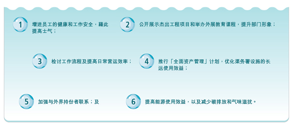 此外,我们现正研究和评估在污水处理设施实施ISO 50001能源管理体系的可行性,从而订出节能的机遇,提高效益。