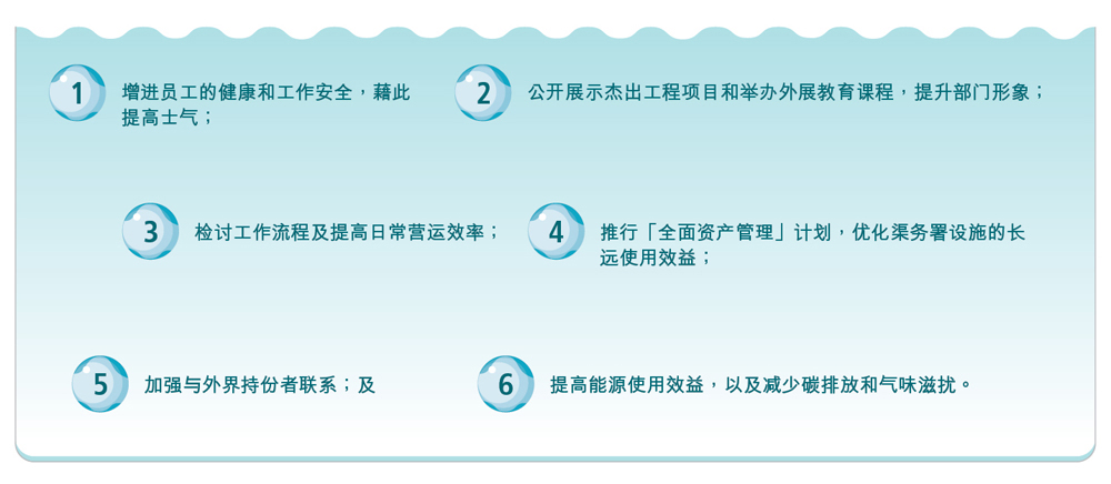 本署的抱负是提供世界级的污水及雨水处理排放服务,促进香港的可持续发展。多年来,本署不断研探和参考适用于部门的国际标准,加强管理措施,寻找可进一步改善的空间。